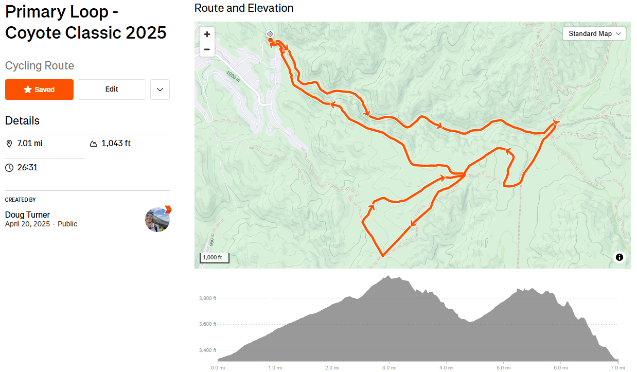 Beginer Course: 2 laps, 14 miles, 1935 Feet of Elevation